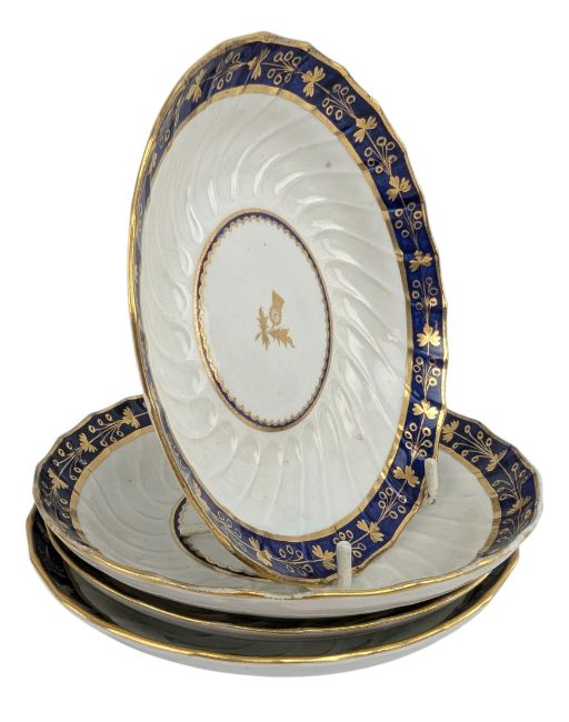 An assortment of early Worcester cobalt blue and gilt porcelain part tea service. The lot includes five Barr, Flight and Barr finger cups and four saucers with gilt thistle motifs to the centre, a larger plate with gilt thistle to the centre, and some with blue crescent to the underside. A Chamberlain Worcester cobalt blue and gilt porcelain handled dish. Together with a similar teapot (a/f).