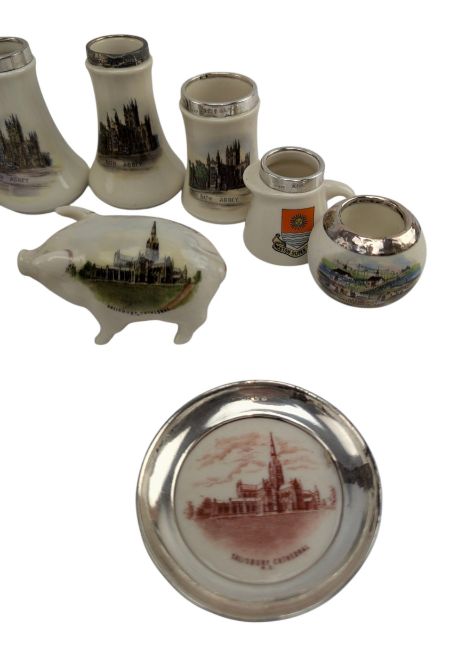A collection of thirteen pieces of West Country interest crested Goss ware trinkets, some being silver rimmed. To include pair of bud vases with depiction of Bath Abbey and more of Bath interest and examples for Clifton Suspension Bridge, Salisbury Cathedral, Wells Cathedral, etc. Eleven with silver hallmarked rims.