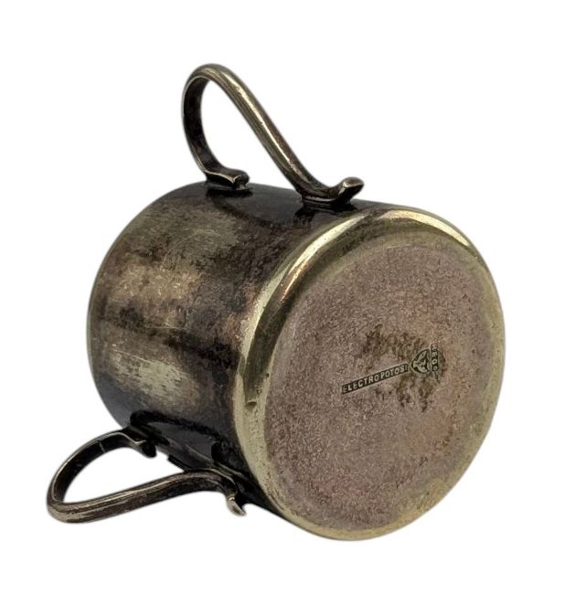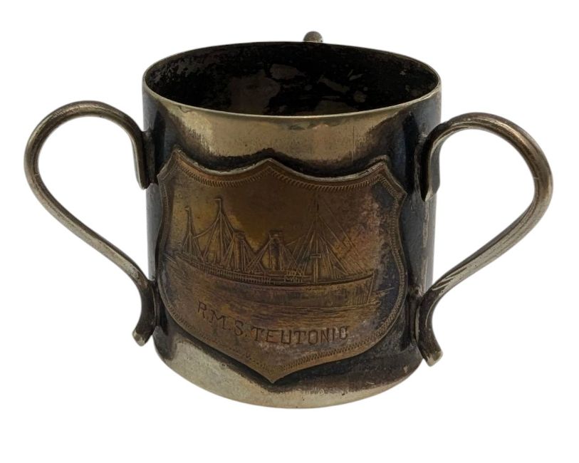 White Star Line interest. An RMS Teutonic crested electroplated three handled loving cup. The decorative cup featuring central copper plaque depicting the R.M.S. Teutonic. Marked Electropotosi to the underside.