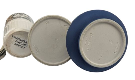 A collection of 20th century silver rimmed Adams Jasperware trinkets and vases, together with two ceramic transfer-printed items. The jasperware in cobalt blue & white, being three three handled miniature loving cups, five bud vases and mug.