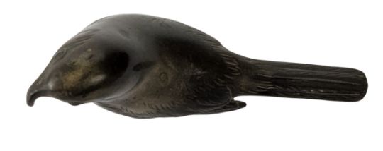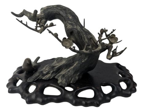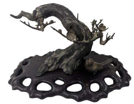 A 20th century Japanese bronze ornament in form of a blossoming tree on a plinth. Together with a bronze bird. Signed to underside.