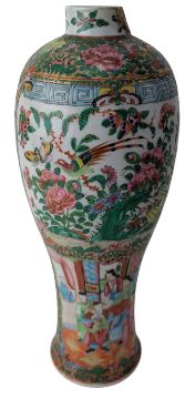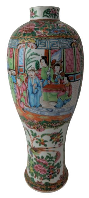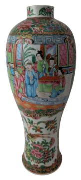 A 19th century Chinese Canton famille rose porcelain vase. The baluster shape vase decorated with two open panels depicting scenes of family within foliate polychrome ground.