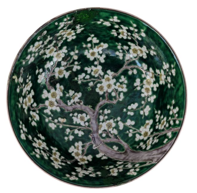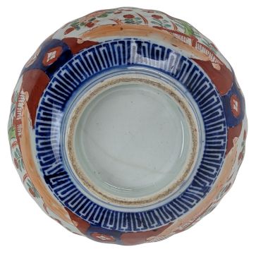 Two large 19th century Japanese porcelain bowls. The lot to included a green ground with yellow flowers Kutani porcelain bowl. Marked to the base. Together with a fluted Imari porcelain bowl painted in traditional blue and red flowers.