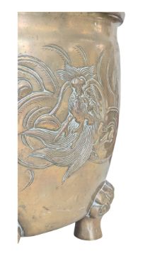 An early 20th century Japanese brass / bronze planter / jardiniere pot. The jardiniere decorated with relief of dragon around the body. Raised on three short legs.