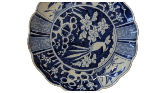 A pair of 19th century Japanese Meiji period blue and white porcelain charger plates. Each plate having lettuce rim, painted with phoenix and floral pattern. 'Qian' marked to the base.