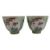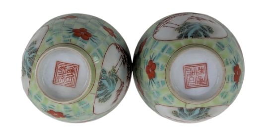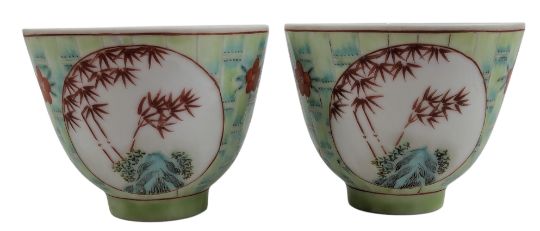 A pair of Chinese copper red & green porcelain tea bowls. Each tea bowl decorated with two panels depicts a scene of rockscape & bamboo, surrounded by bamboo and flowers ground thoughtout. Four character 'Tongzhi Nian Zhi' to the base.