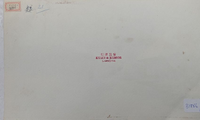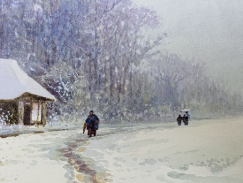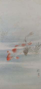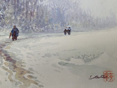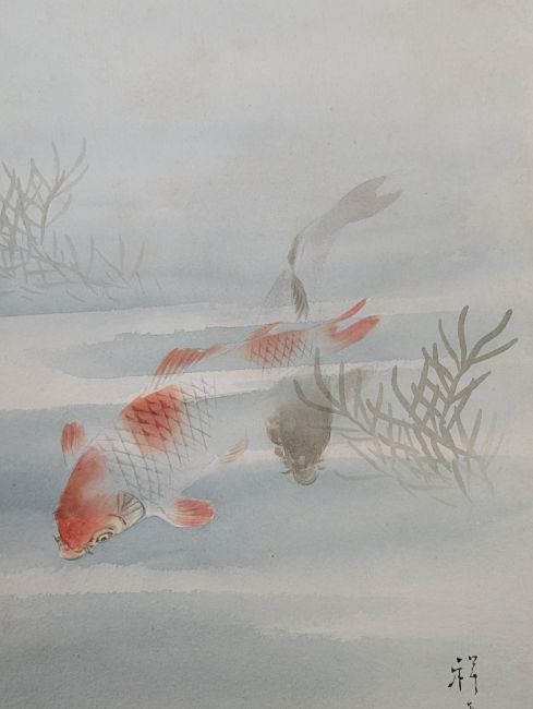 Kuhn & Komor 康茂洋行 - two early 20th century Japanese watercolour paintings. The lot to include a watercolour depicting a showy landscape in Japan. Signed by the artist. Stamp by Kuhn & Komor Shanghai. together with a watercolour depicting two koi fish. Signed by the artist. Both unframed & unglazed.