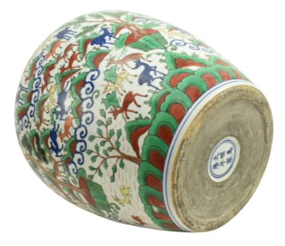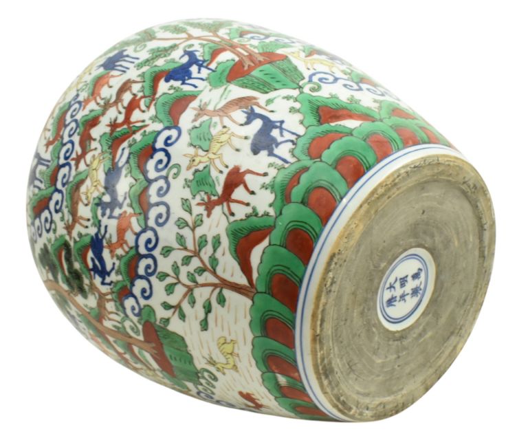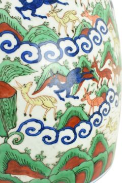 A large 19th century Chinese wucai famille verte porcelain jar. The jar is boldly decorated in underglaze blue, iron-red enamel, and green, yellow, and aubergine glazes with the auspicious 'hundred deer' design. The deer are depicted in resting, grazing and at playful leisure in a continuous landscape, all below a ruyi border on the shoulder beneath the neck decorated with floral sprays. Six character 'Da Ming Wanli Nian Zhi' mark to the base.