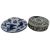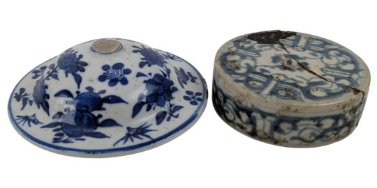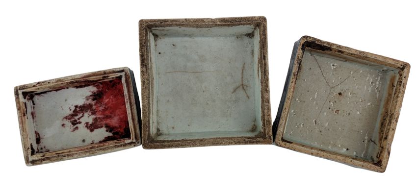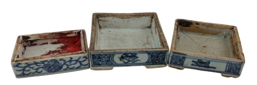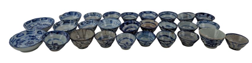 A collection of Qing Dynasty possibly Shiwan blue & white ceramic tea cups / wine cups. The lot to include twenty five pieces of blue & white tea cups in various abstract designs and sizes. Together with two small blue & white saucers decorated with abstract floral design. Further togeher with a celadon dish. Hallmarked to the base. Along with three seal box and a cover.