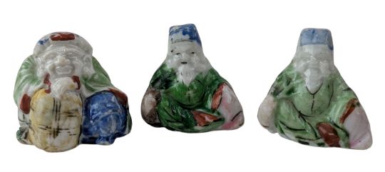 Collection of three 20th century Japanese miniature figurines of lucky gods. The lot to include two figurines of Jurojin with this sacred deer and a Daikokuten standing on rice bales.