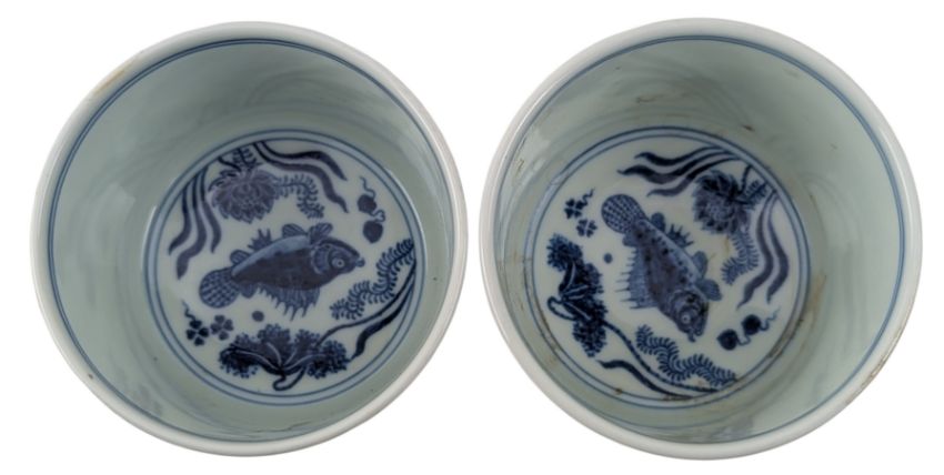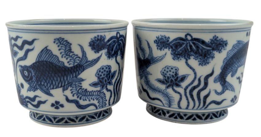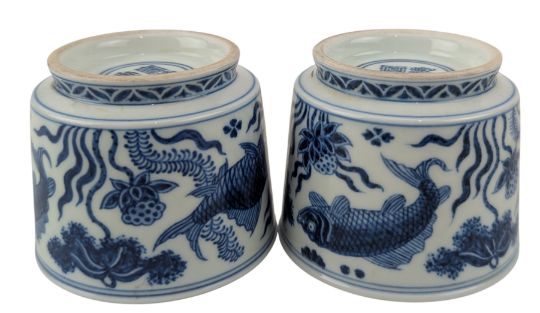 A Chinese blue & white porcelain teacup. The gently tapering cylindrical tea cup raised from a waisted short foot rim. Painted with fish and lotus flowers to the body. Four character 'Xunde Nian Zhi' with double blue ring marked to the base.