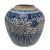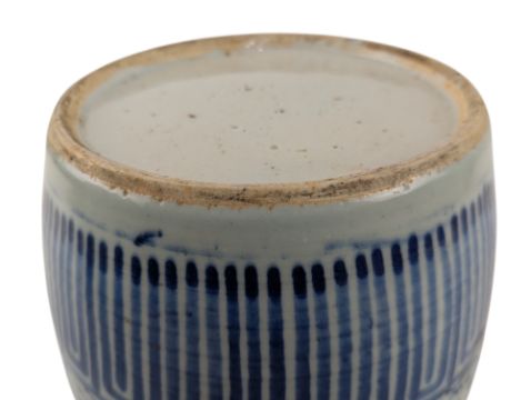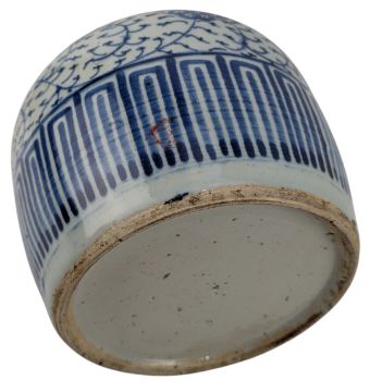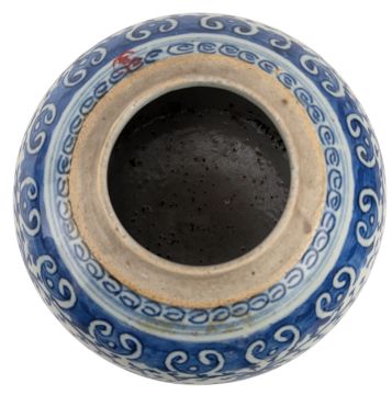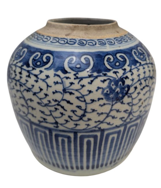 A Qing Dynasty blue & white porcelain ginger jar. The ovoid shaped jar decorated with abstract scrolling to the neck, ruyi cloud motif tot the shoulder, interlocking floral motif to the body and geometric fret motif to the bottom.