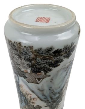 A 19th century blue & white procelain bowl decorated with a dragon. Together with a 20th century small famille verte sleeve vase with flared mouth rim on a cylindrical body. Decorated with landscape, houses and a poem. Signed to the base.