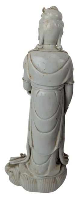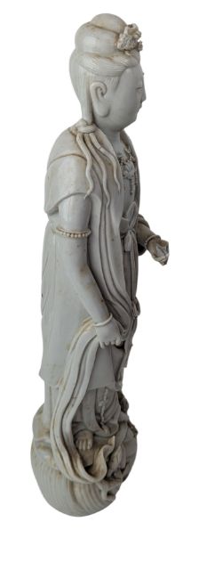 Two late Qing Dynasty blanc de Chine figures of Guanyin. The lot to include a Dishui Guanyin holding a vase pouring water with Tongzhi / Sudhanakumara. Together with a standing Guayin on a lotus plinth.