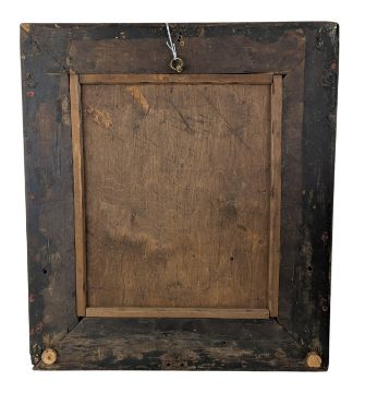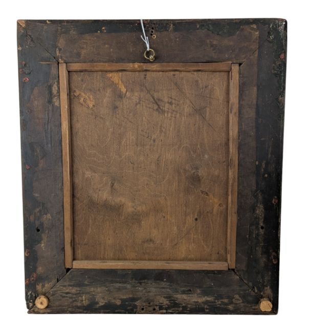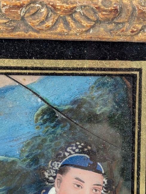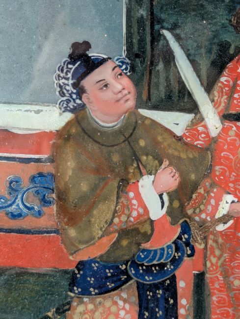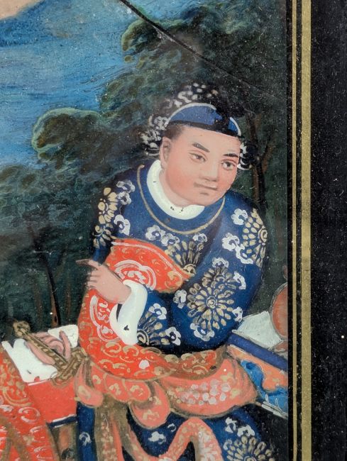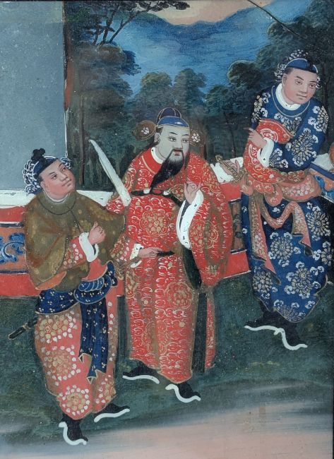 A 19th century Chinese export reverse painting on glass depicting three gentlemen wearing traditional Ming dynasty attire. Framed in a heavy gilt wooden frame.