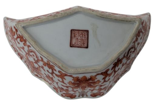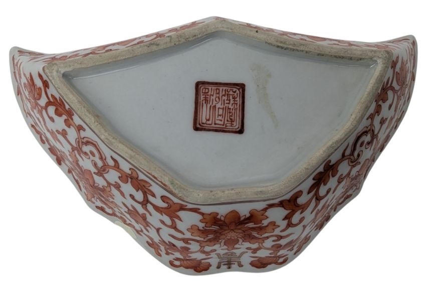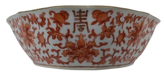 A pair of 19th century Guangxu iron red porcelain bowls / dishes. Each bowl decorated with lotus interlocking throughout, a symbole of 'Longevity' in gilt and gilt rim. Six character 'Da Qing Tong Zhi Nian Zhi' marked to the base.