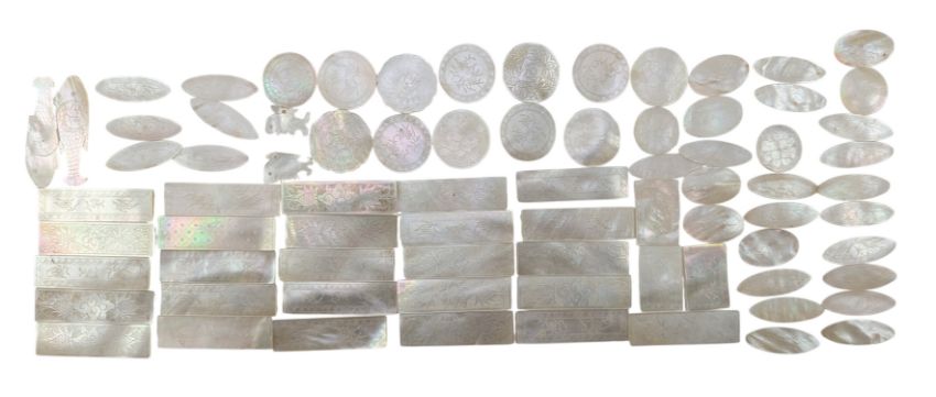 A collectiono of 20 pieces 19th century Chinese hand carved mother of pearl game tokens. Each token carved with a dragon amidst houses and landscapes on one side, other side carved with a various scene of figurines.