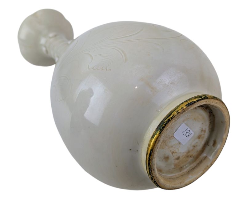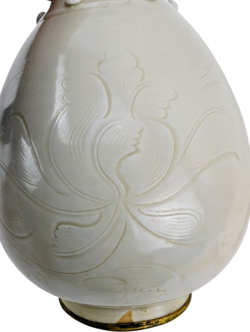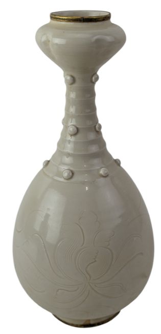 A Northern Song style Dingyao white glazed garlic mouth vase. The vase pootted with a bulbous body rising to a garlic-form head. Gilt metal mounted rim. Rings and studs decoration to the neck. Raised on a short foot rim.