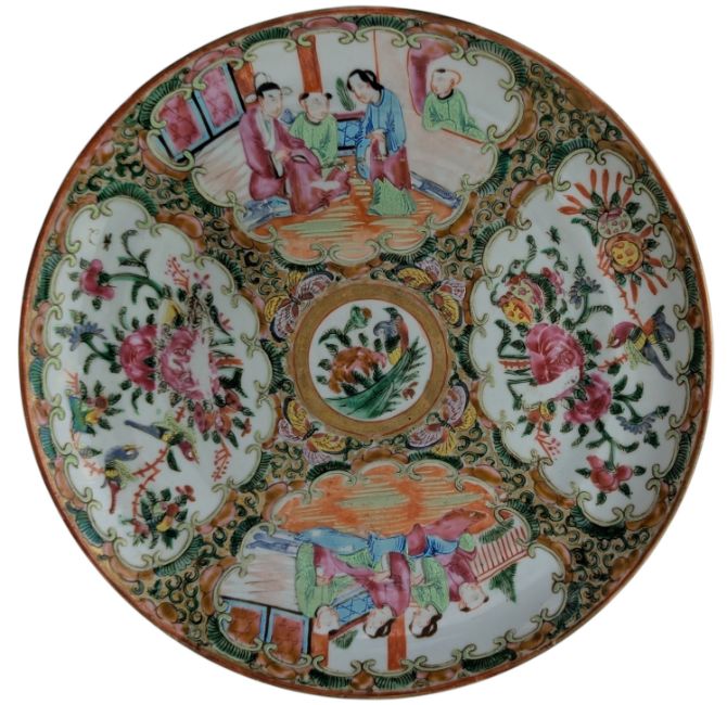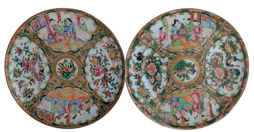 A pair of 19th century Qing Dynasty Canton Famille rose porcelain charger plates. Each circular plate being decorated with enameled figures, birds and fruits.
