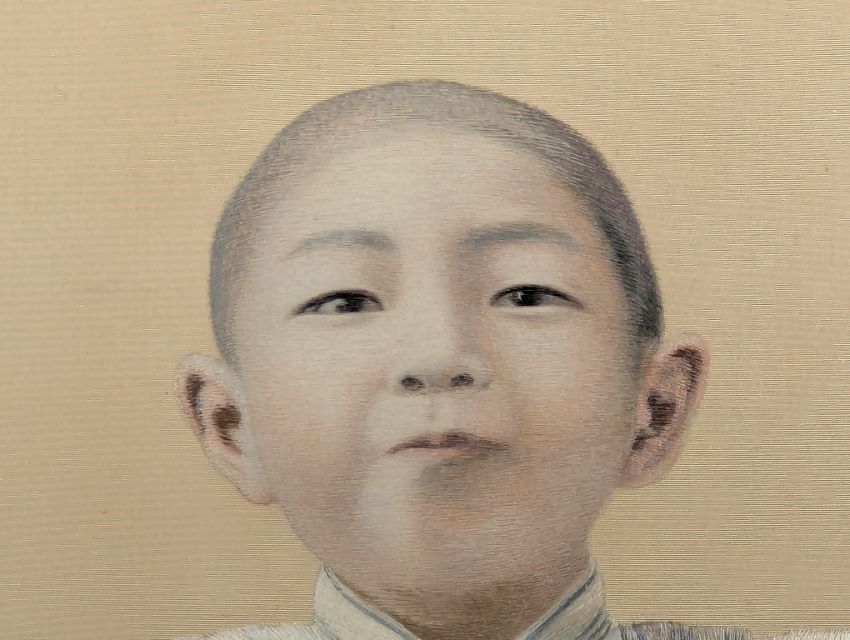 A 20th century Japanese hand embroidey on silk panel. The panel depicts a boy eating a watermelon. Framed & glazed.