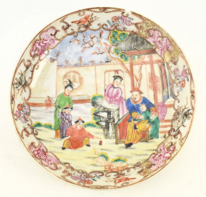 A collection of three Qing dynasty Mandarin famille rose porcelain bowls & plate. The lot to include a pair of bowls decorated with figurines. Together with a famille rose porcelain saucer depicts a scene of a family in the garden.