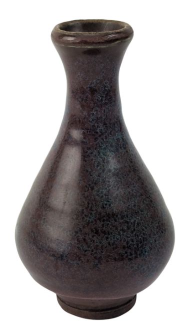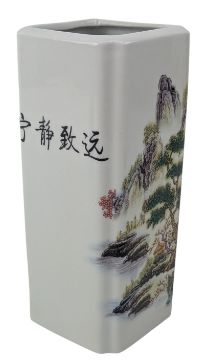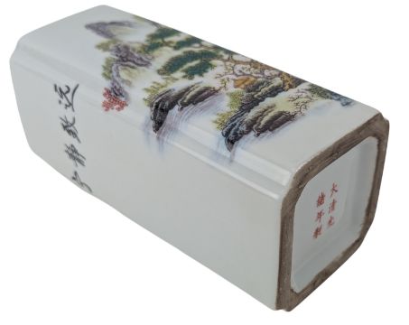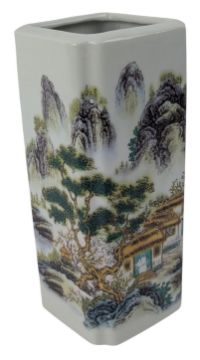 A small junyao glazed vase. The vase covered with thick red & speckled blue glaze. Unglazed to to the bottom and base. Together with a square four section brush pot. The brush pot decorated with houses & landscape. Six character 'Daqing Guangsu Nian Zhi' marked to the base.