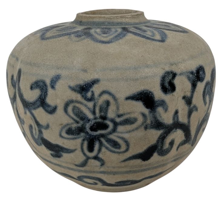 A 14th/15th century Vietnamese Annamese blue and white oil jar. The ovoid shaped jar decorated with floral & foliage to the body.