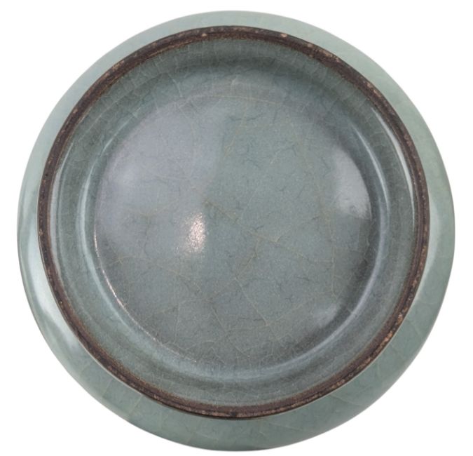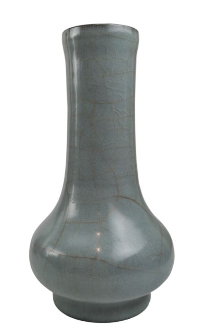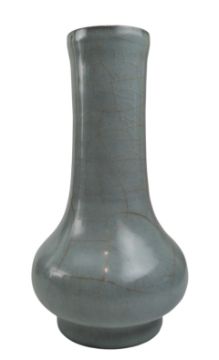 A Chinese Song or later Longquan celadon Guan type bottle vase. The pear shaped body with elongated cylindrical neck. Raised on a short foot.