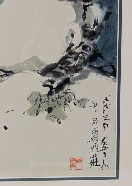 A 20th century Chinese ink & colour painting. The painting depicts a man resting on a rock. Signed. Framed & glazed.