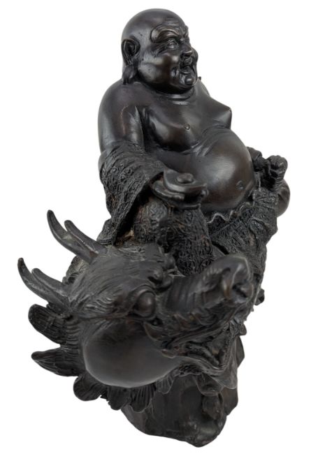 A large Chinese bronze Laughing Buddha Budai seated upon a chiwen. The Laughing Buddha wearing a drapery with one hand holding a gold ingot and the other holding a sack of gold, seating upon a chiwen.