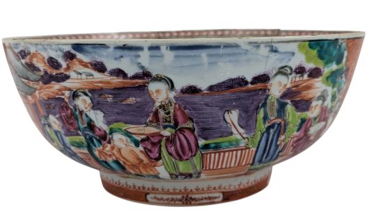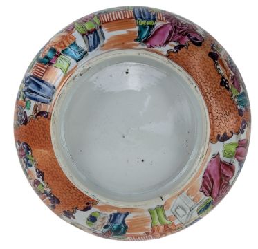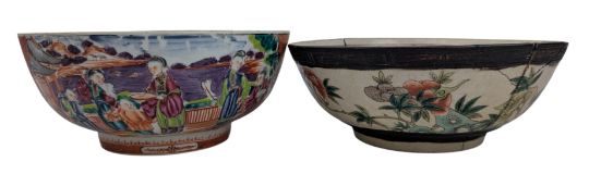 A 18th century Chinese Qing dynasty export famille rose 'Madarin palette' porcelain bowl. The bowl being painted with shaped panels depicting scenes and adorned with leafy fronds on a ground of interlocking diaper pattern. To interior with pendant motifs and foliage sprays encircling a central panel painted with a lady and boys. Together with a Nanking crackled glazed bowl. The bowl being decorated with flowers to the exterior with two oxidized bands. To interior, a medallion panel painted with a heron in the centre, flowers and leafy scrolling to the rim.