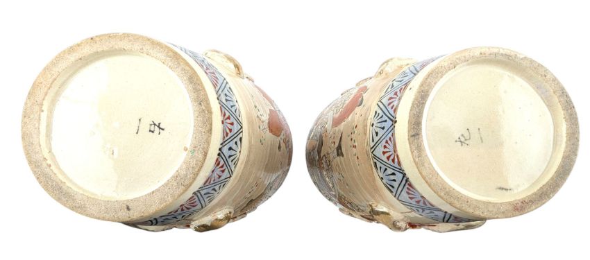 A pair of 19th century Japanese Meiji period Satsuma vases. Each baluster shaped vase decorated with scenes of warriors. Flanked by two ring shaped handles. Signatures on the bases.