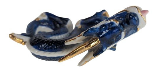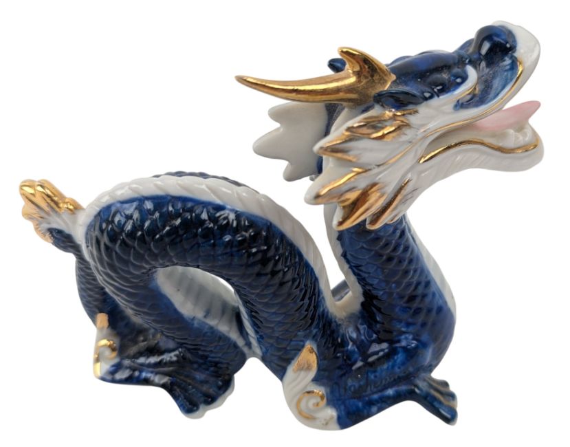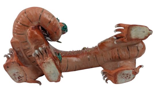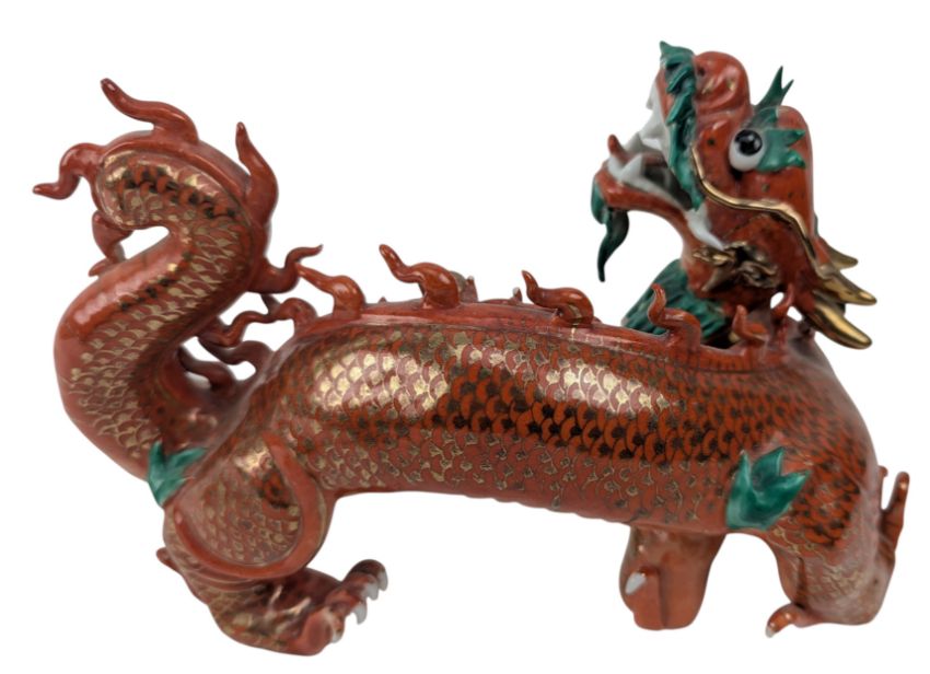 Two 20th century Chinese export porcelain Dragon centrepiece. The lot to include a coral ground dragon with gilt scale dragon. Jindezheng marked to the base. Together with a blue and white and a small jade green coloured dragon.