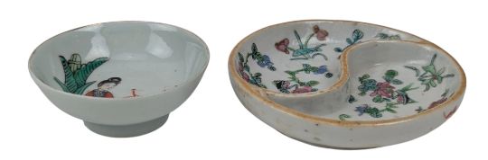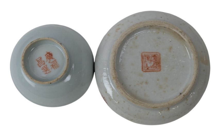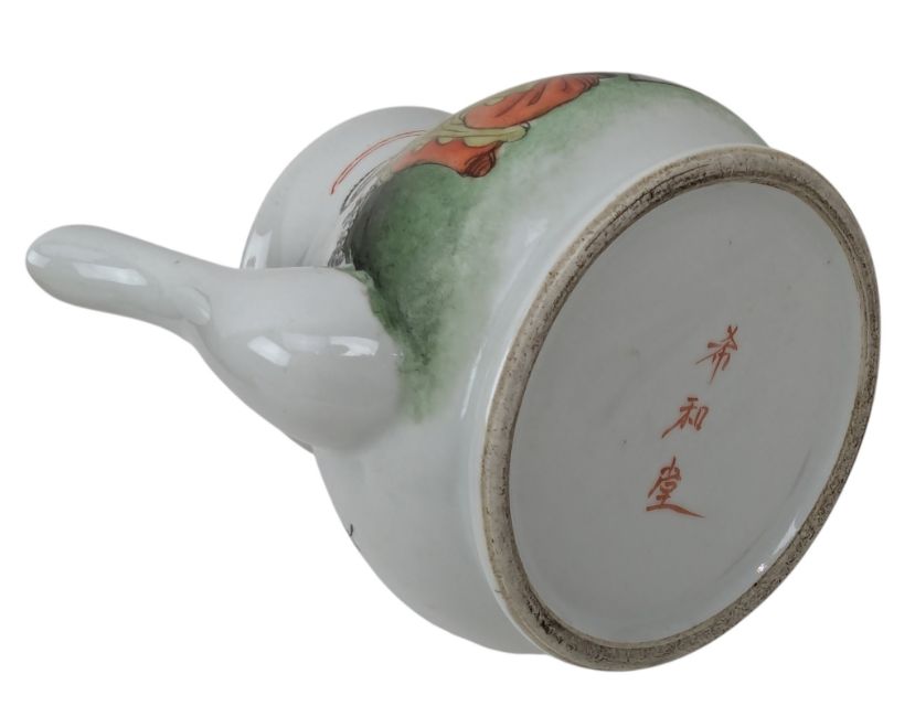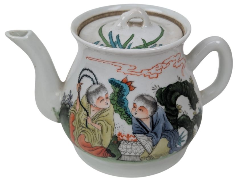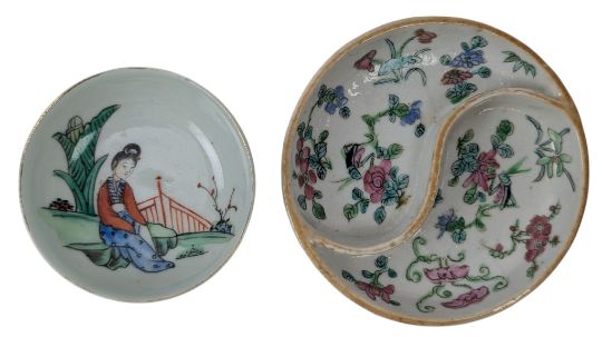 A collection of three early Republican Chinese porcelain pieces. The lot to include a famille rose teapot decorated with two playful boys and rockscape. 'Xi Hetang' Hallmarked to the base. Together a Canton famille rose divider plate decorated with flowers & foliate. Further together with a small saucer / teacup decorated with a lady in a fenced garden. Four character 'Guang Fuchang' hallmarked to the base.