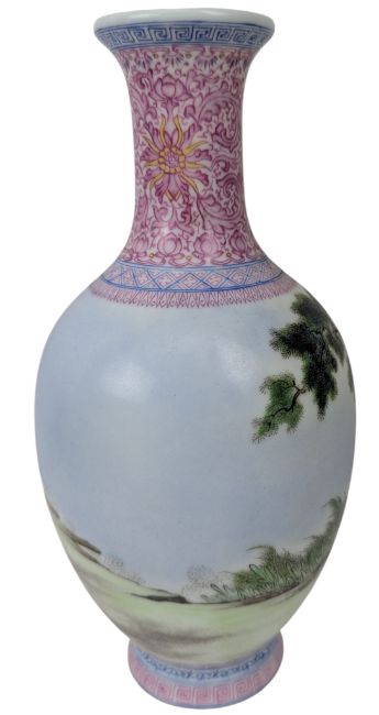 A 20th century Chinese famille rose figurine porcelain vase. The baluster shaped vase decorated with a European scene depicts a lady with two children in the field under a tree. Four character 'Qianlong Nian Zhi' marked to the base.