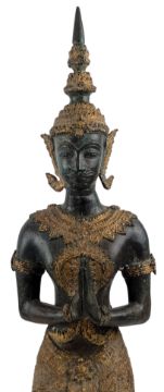 A 20th century Thai patinated bronze and parcel gilt figure of kneeling Teppanom Guardian.The Buddha's face with serene expression and elongated earlobes, his hair raised to a domed unisa and topknots, seated in dhyanasana on a curved triangular pedestal, with hands held in dhyana mudra. Raised on a lotus base.