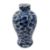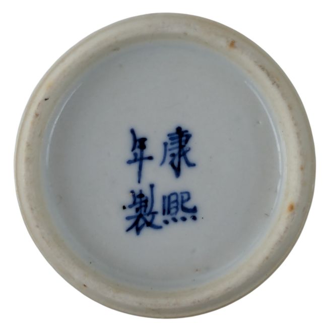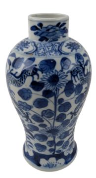 A small 19th century Qing Dynasty blue & white vase. The baluster shaped vase decorated with sprigs of flowers to the neck, 'shizi' motif and floral to the shoulder, two four clawed dragons amidst peonies to the base. Four character 'Kangxi Nian Zhi' marked to the base.