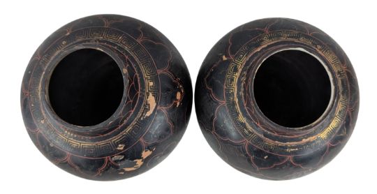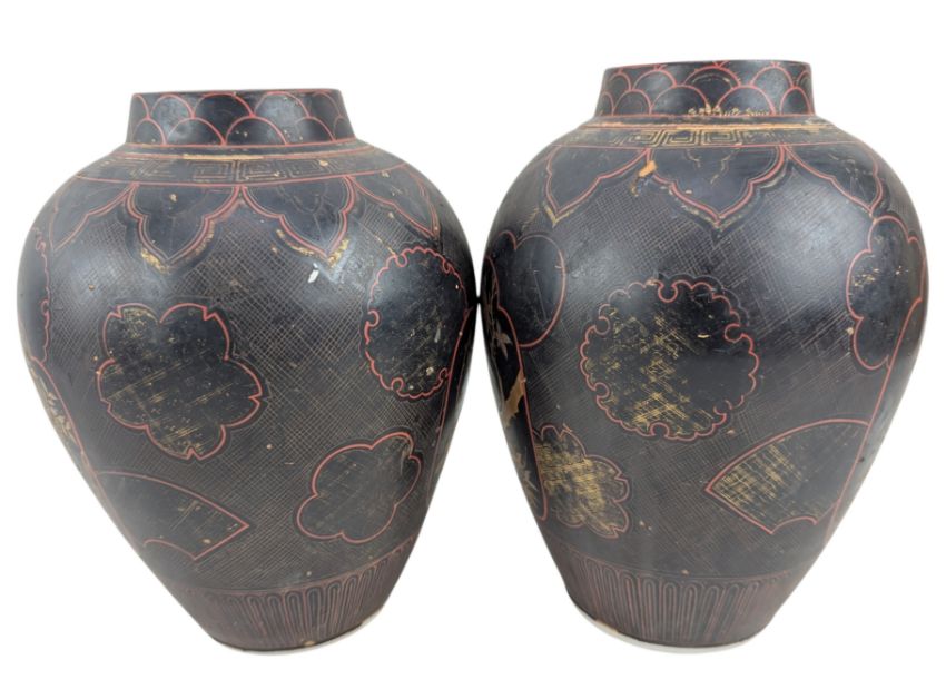 A pair of 19th century Chinese / Japanese hand painted porcelain vases with gilt details. Each ovoid form vase has a short mouth rim decorated with scale motif, gilt fret motif to the neck and diaper pattern to the shoulder. Two open panels depict flowers and bird. Unmarked to the base.