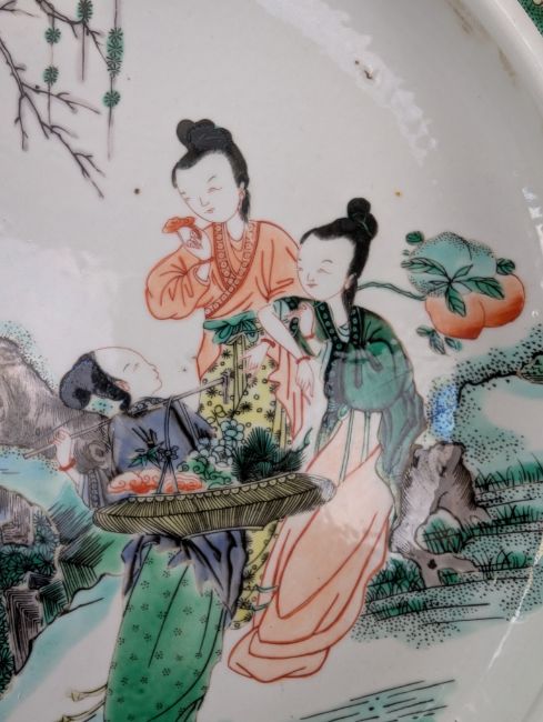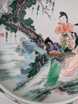 A large Qing dynasty wucai famille verte porcelain brush washer. The round deep brush washer decorated with three ladies carrying fruits and flowers by the river. Auspicious emblems on the border. Sprigs of flowers to exteror. Six character mark 'Kangxi Nian Zhi' with double blue rings marked to the base.