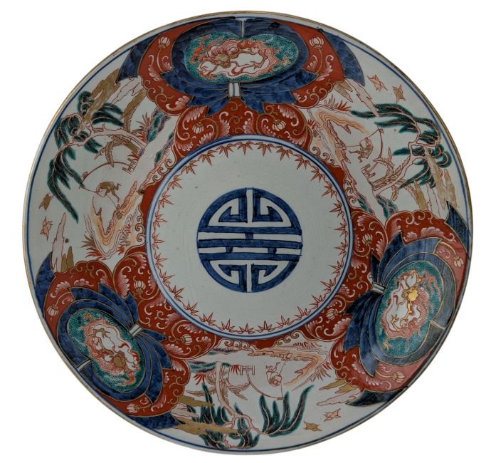 Two late 19th century Japanese Meiji period Imari porcelain chargers. The lot to include a large circular charger decoated with a Chinese 'longevity' symbol in the centre surrounded by landscape and three open panels depicting a dragon with flames. Marked 'FU Gui Chang Chun' to the base. Together with a smaller circular charger decorated with lanscape and antiques.
