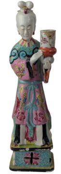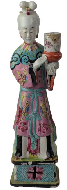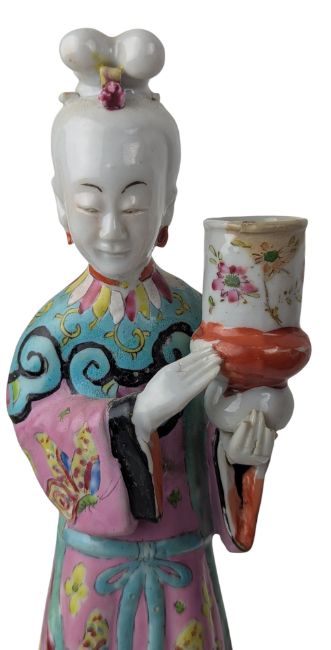 A Qing Dynasty famille rose porcelain figure of a lady. The lady wearing a robes richly decorated in famille rose enamels with butteflies and floral patterns picked out in turquoise, yellow, pink and gilt. Her hair tied in an elaborate chignon. Holding a vase in her hand.