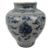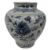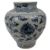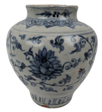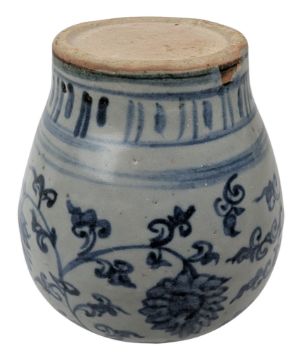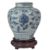 A small Ming Dynasty blue and white ceramic jar with lotus design. The jar decorated with an interlocking lotus scroll. Comes with wooden stand.