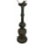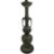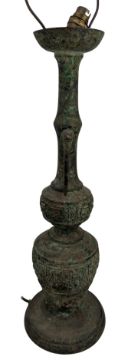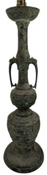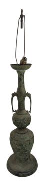 A tall 20th century Japanese patinated bronze table lamp. The lamp having a baluster body with elongated neck, decorated with archatic style mask motif, flanked by mythical beast handles and a flared mouth rim. Sold as untested.