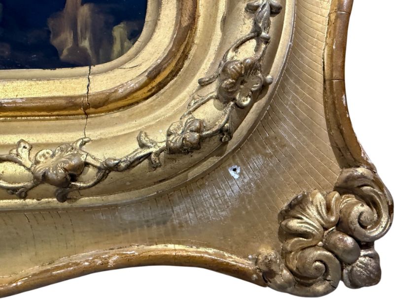A Qing dynasty reverse painting on glass. The painting depicts a lady holding a fruit basket next to a tree. Gilt framed.
