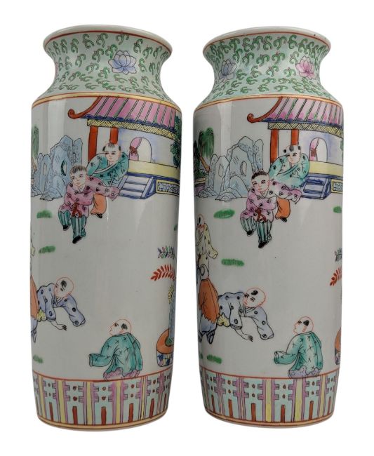 A pair of mid century Chinese famille rose porcelain sleeve vases. Each cylindrical vase has a waist neck with a flared mouth rim. Decorated with playful children.