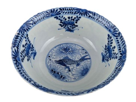 A Qing dynasty blue and white porcelain fish bowl. The bowl decorated with lectuce rim, fish and algae to the body. Four characters 'Kangxi Nian Zhi' to the base.