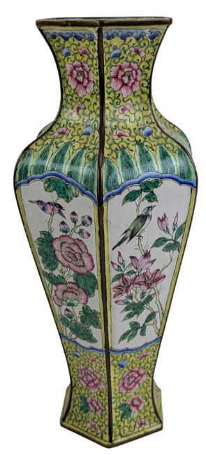 A 20th century Chinese bronze base enamelled vase. The facetet vase being enamelled with birds and florals with yellow ground.