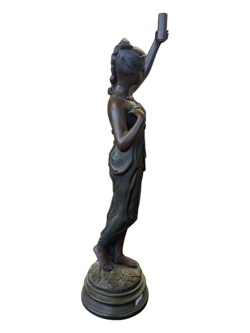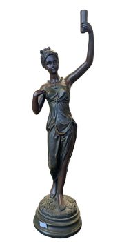 Late 20th century bronzed resin art nouveau style torch bearer figurine. Depicting a lady dressed in a robe holding up a torch while walking on a foliate moulded plinth style base. Measuring approx. 50cm tall.