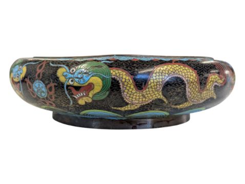 A 20th century Chinese cloisonne bowl. With large dragon figure to interior and outside. Black ground with blue streaks and metal working. With character marks to underside.