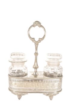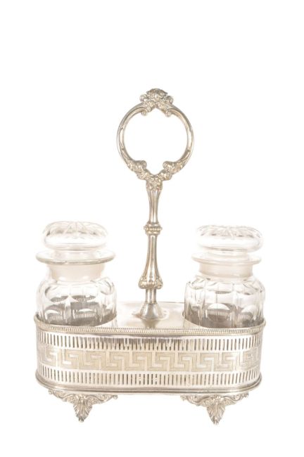 An early 20th century silver plated caddy with oil, vinegar and other bottles in a circular pierced tray. Toegther with a plated caddy containing two preserve / jam jars with stoppers, held within a silver plated holder with anacathus leaf legs.